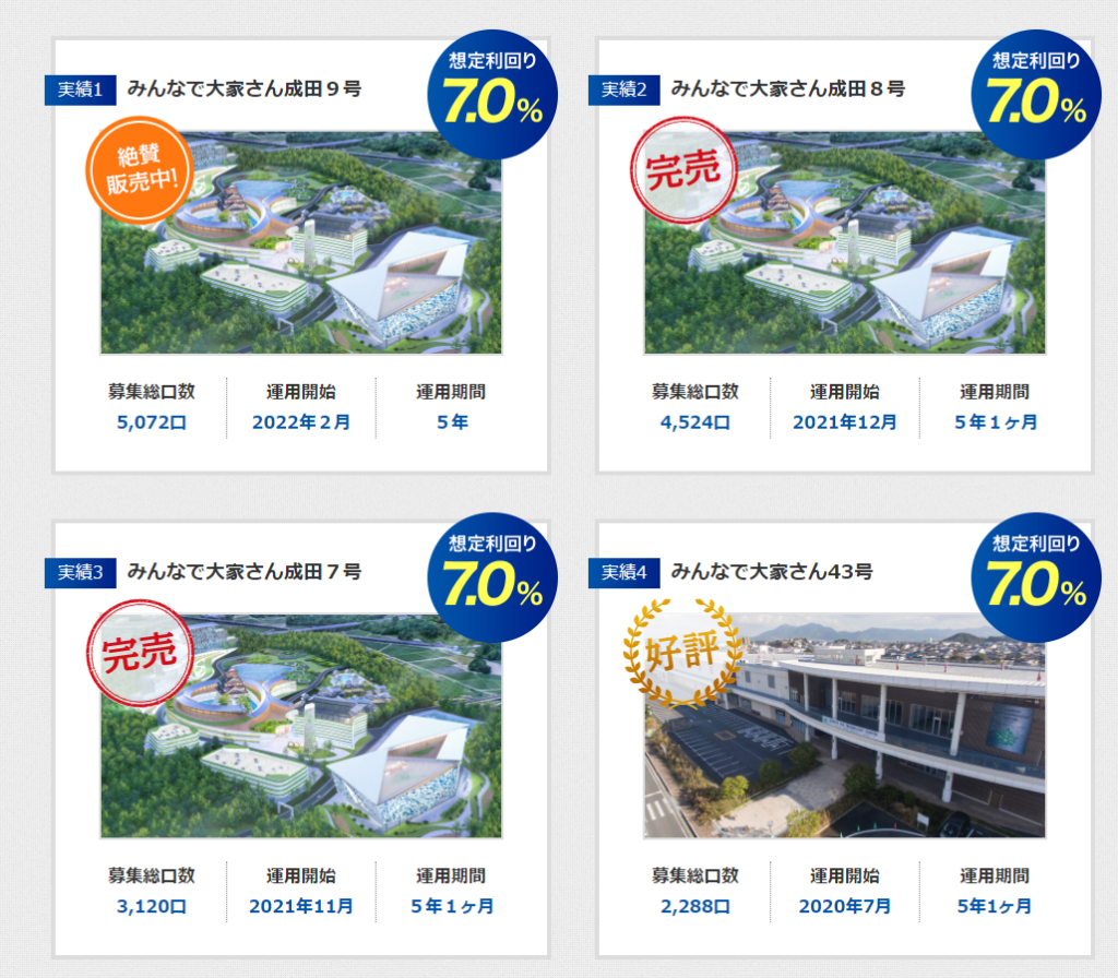 このみんなで大家さん。今、成田9号が販売中で、過去の第1号から始まり、いくつかは元本を償還したとPRしています。