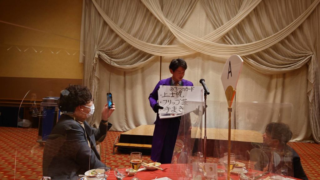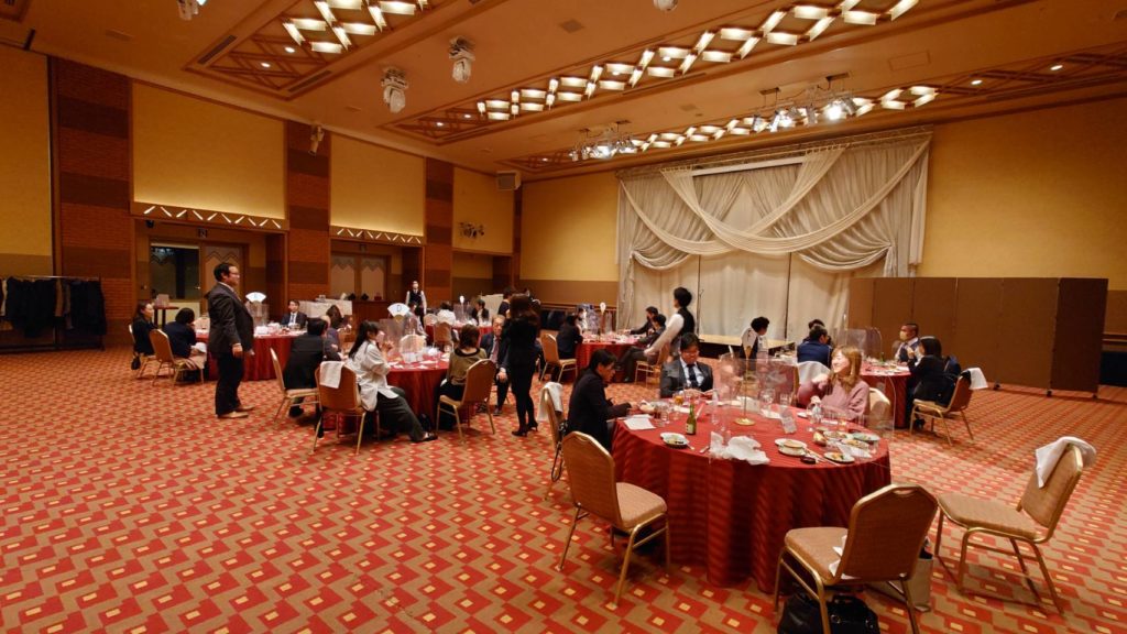 パーティ―形式でソーシャルディスタンス距離を取って行いました。会場の雰囲気が結婚式のような感じになってしましましたが、料理も美味しく、無謀な一気飲みもなく、上品な忘年会で1年締め括りとなりました。