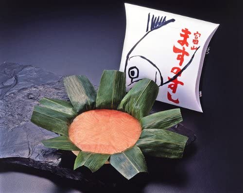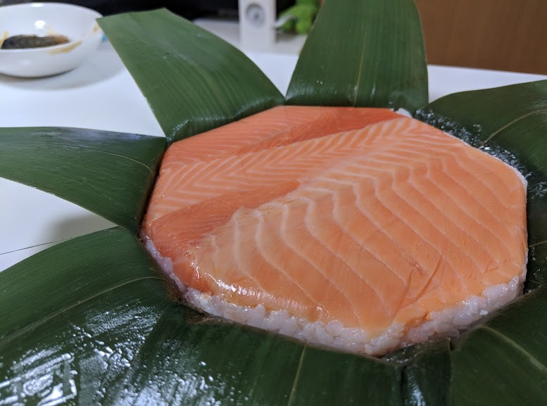 薄くスライスされた鱒の身が、すし飯(もち米?)の上に圧着されている押し寿司です。酢が効き方が絶妙に良く、魚の身と米が口の中で、踊るような絶品です。